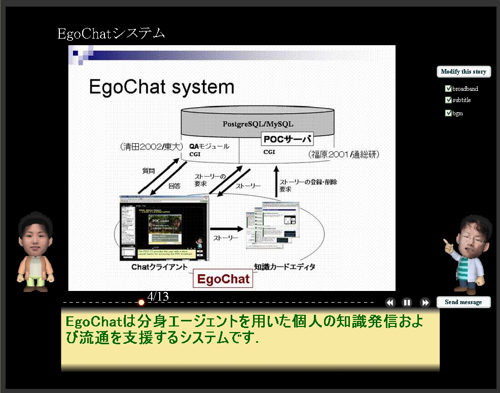 EgoChatはコンテンツの製作・仲介・プレゼンテーションを支援する会話エージェントシステムです[久保田2003].