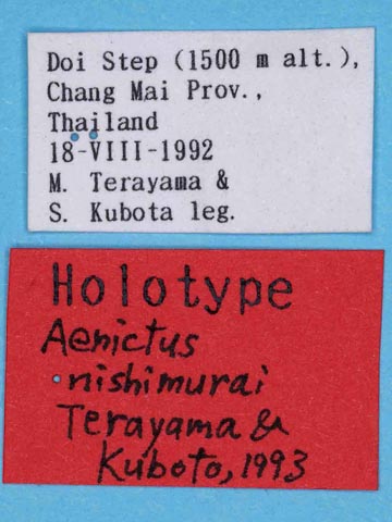 | Ref.: | Terayama, M. & S. Kubota, 1993. The army ant genus Aenicus (Hymenoptera: Formicidae) from Thailand and Viet Nam, with descriptions of three new species. Bulletin of the Biogeographical Society of Japan 48 (2): 68-72. |