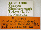 | Ref.: | Konishi, K., 1996. A revision of the subgenus Paropheltes Cameron of the genus Netelia Gray (Hymenoptera, Ichneumonidae) of Japan. Japanese Journal of Entomology 64 (1): 163-187. |