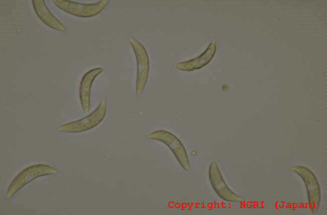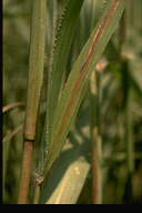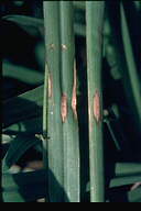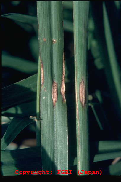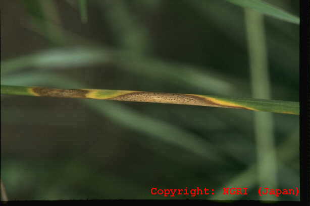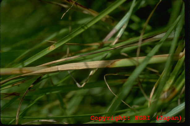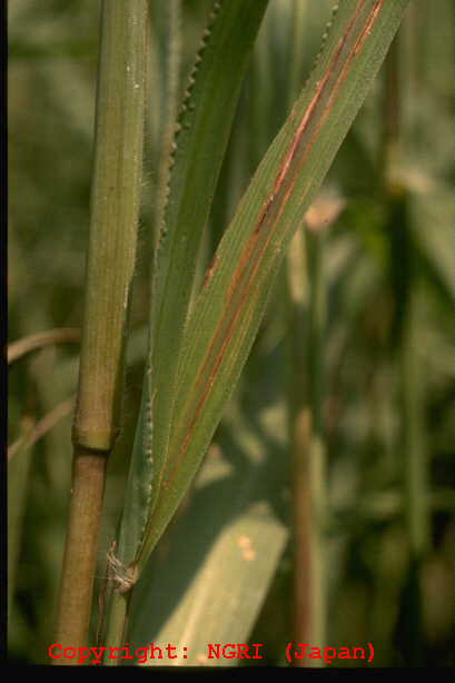 若い葉では初め灰白色、楕円形の小病斑を生じ、これが葉脈に沿って次第に縦に広がり、赤褐色の長い条斑になる。病斑部は紙のように薄くなって裂けやすくなる。罹病葉上からは多数の細菌が検出され、これが風雨などにより飛散して伝播する。病原バクテリアはトウモロコシ、イネ、アワ、シコクビエ、キビなど多くのイネ科植物に寄生する。 |