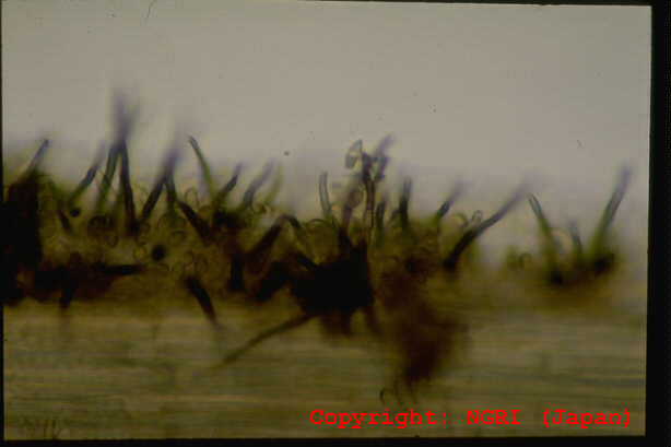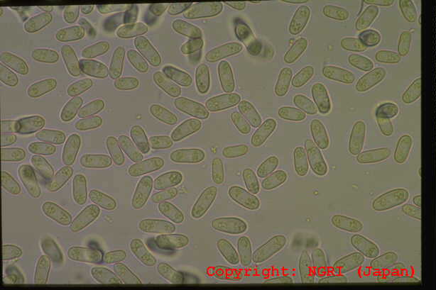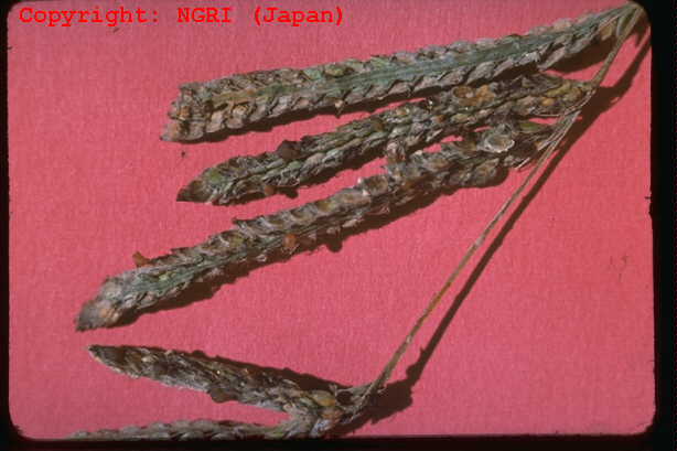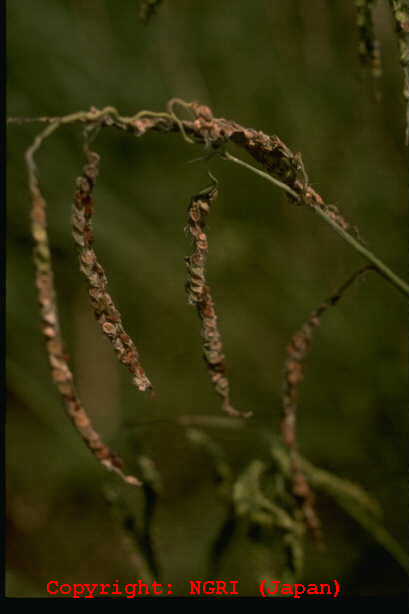 暖地で発生の多い穂枯性の糸状菌病。出穂後、穂が灰色から黒色の菌叢に覆われ、枝梗が互いに接着された状態となり、穂全体がかびる。葉には白色の菌叢が葉脈に沿って条状に現れる。病原菌はエピファイト(表生菌)として植物全体に感染し、感染植物は耐虫性を持つようになることが報告されている。 |