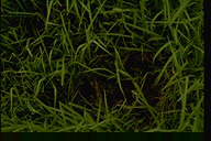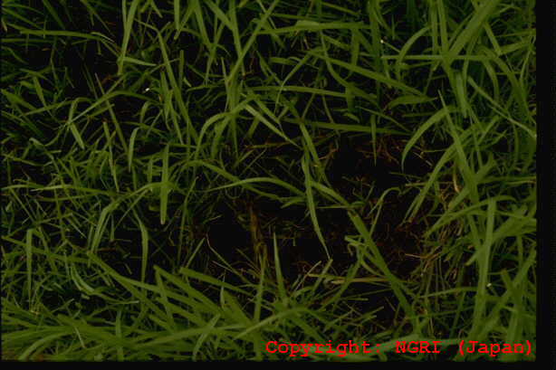 暖地での発生が多い株枯性の病害。初め灰緑色、水浸状に葉が変色し、やがて熱湯をかけたように軟化していく。葉には大型の病斑が形成される。発病した草地はつぼ状に枯れ、徐々に裸地化が進む。病原菌は未同定である。 |