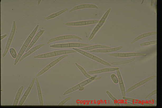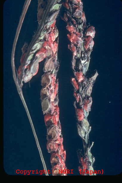 穂での発生が問題になる糸状菌病。穎花が赤〜褐色となり、穎の合わせ目などにピンク色のかびが生える。葉でも発生し、米粒大程度の同心輪紋を持つ楕円形病斑を形成する。病原菌は土壌中でも長く生存し、これが一次伝染源となる。他にイネ、麦類など多くの穀類で発生する。 |