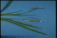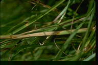 暖地で発生の多い葉枯性の糸状菌病。病斑は橙色から灰褐色、楕円形から紡錘形、長さ5mm程度で、古くなると中央部に剛毛を形成し、黒くかびて見える。病斑周囲は激しく黄化し、病勢が進展すると病斑が融合して葉枯症状となる。病原菌は他のイネ科植物の炭そ病菌と同種だが、寄生性が異なるとされる。 |