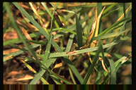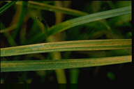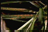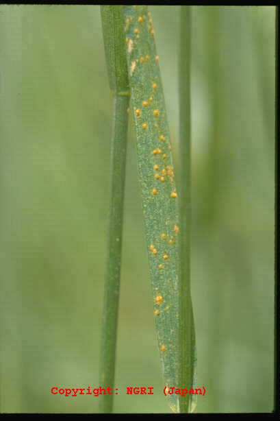 ブルーグラスのさび病の中では、最も被害が大きい。葉の表に円形から長楕円形の夏胞子堆を形成し、表皮が破れて橙黄色の粉を飛散する。やがて夏胞子堆は葉表面に密生し、激発すると植物体全体が黄色く見える。冬胞子堆は黒色、長楕円形から線形、長く表皮に被われ、やや隆起する。 |