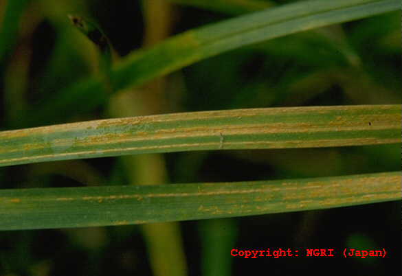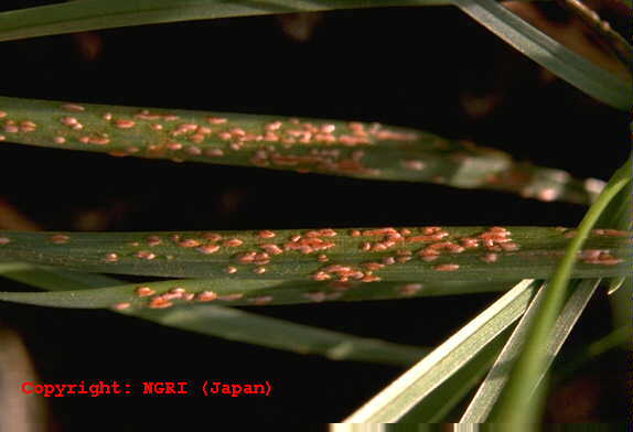 さび病の一種。葉、葉鞘および稈の表面に橙黄色、楕円形、長さ1mm程度の腫れ物状の病斑が縦に連なるようにできる。病斑は成熟すると表面が破れて夏胞子を飛散させる。冬胞子堆は葉では裏に生じることが多く、灰黄色、あまり隆起しない。病原菌はチモシーにも寄生する。 |