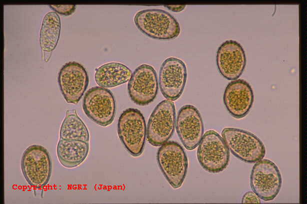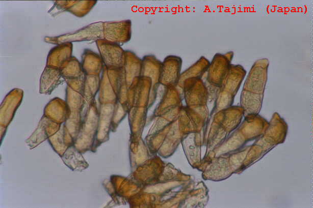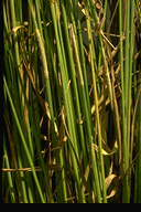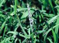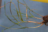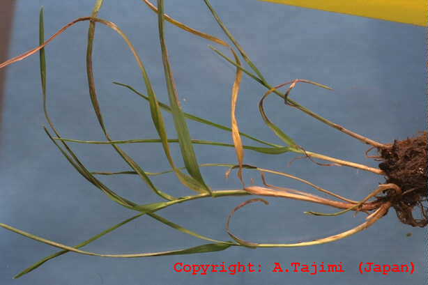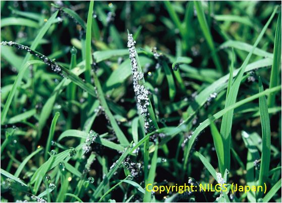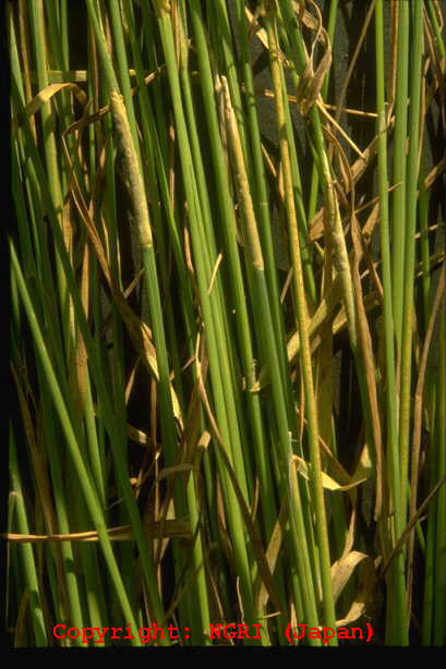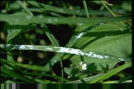 発生すると出穂を阻害し、採種栽培で問題となる糸状菌病。春の終わりに止葉周辺の葉鞘を巻くようにして、がまの穂状に長さ1ー3cmの白色菌叢が形成される。この表面には多数の分生子が形成される。 |
