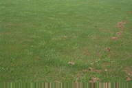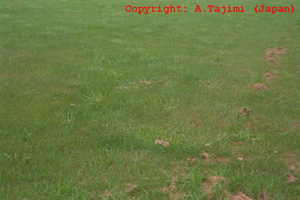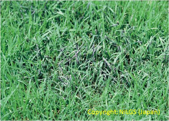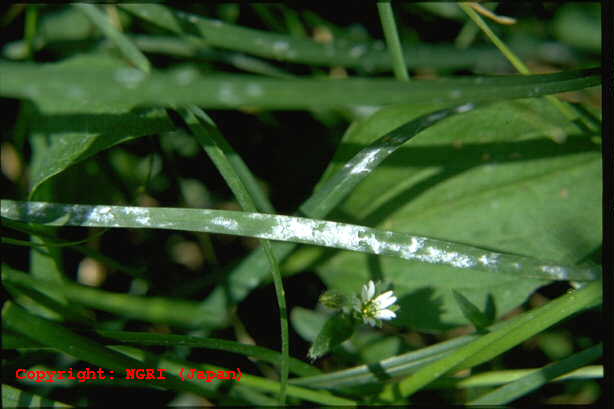 うどんこ病は、日本では芝草類としてはブルーグラスにのみ発生する。病斑は初め葉身上の白い絹糸状菌叢であるが、すぐに拡大して相互に融合する。病斑はこのとき灰色に変わり、表面は粉状となる。寡照多湿条件で多発する。ターフとしては、広い範囲で白く薄汚れたような状態となる。病原菌は他のイネ科植物のものとは、寄生性が異なる。 |