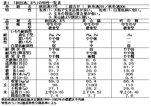 「秋田酒こまち」は1992年に秋田県農業試験場において、「秋系酒251」を母、「秋系酒306」を父として人工交配し、選抜・固定を進めてきた品種であり、2000年F8より「秋田酒77号」の系統名を付し奨励品種決定試験で検討してきた。 |