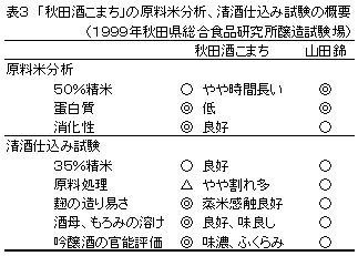 清酒仕込み試験では、酒母、もろみの溶けが良好である。吟醸酒の官能評価では、味が濃く、ふくらみがあり上品な酒質である(表3)。 |
