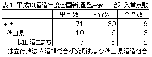 平成13酒造年度全国新酒鑑評会第I部(山田錦以外を原料とする)において、出品7点中5点が入賞し、うち2点は金賞を受賞している(表4)。 |