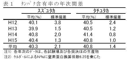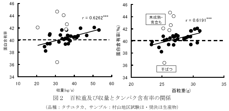 山形県の大豆作付け面積は飛躍的に拡大しているが、収穫量や品質の年次変動やロット間でバラツキが大きく、実需者サイドからは安定した品質・量の供給が求められている。そこで、県産大豆の主要な加工用途である豆腐について、加工適性上重要とされている子実中のタンパク含有率の変動を明らかにし、県産大豆の収量・品質の高位安定を目指す資料とする。 |