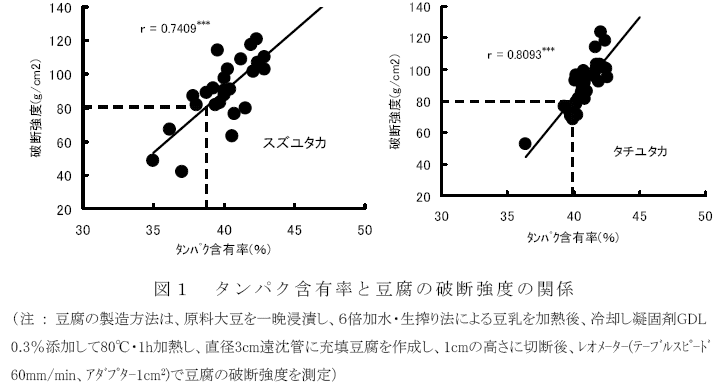 山形県産大豆のタンパク含有率と豆腐の破断強度の関係 |