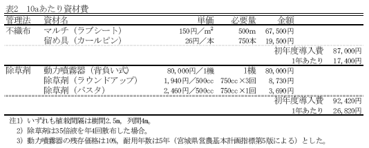 マルチ資材の10aあたり資材費は、初年度導入費に8万7千円かかる。資材の減価償却期間を5年とすると、1年当たり導入費は除草剤による雑草管理の場合と同等である(表2)。 |