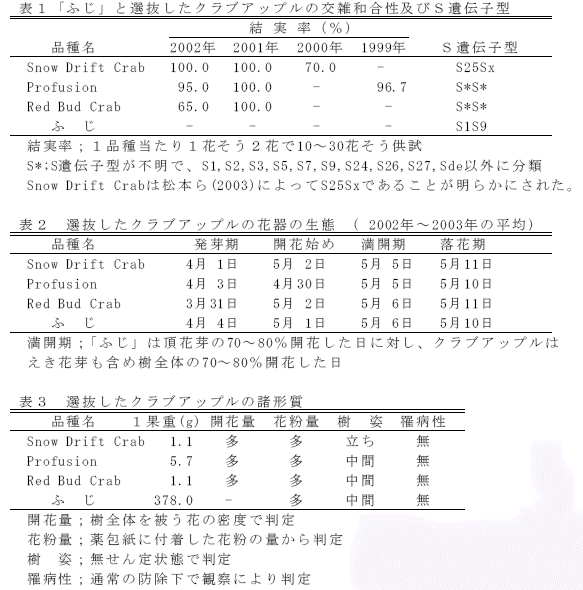 選抜した「Snow Drift Crab」、「Profusion」、「Red Bud Crab」の3品種は、いずれも「ふじ」に対し高い結実率を示し、S遺伝子型の解析からも交雑和合性を具備している(表1)。 |