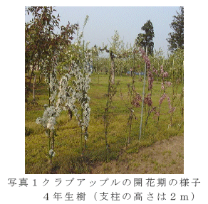 これら3品種の開花量は、いずれもえき花芽の比率が高いことから、開花した花弁によって1年枝全体が被われるほど密度が高く、花粉量も「ふじ」並みに多い。(表3、写真1)。 |