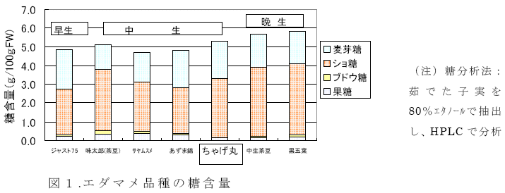 岩手県で育成した「ちゃげ丸」はエダマメ用黒大豆中生品種で、従来の黄大豆のエダマメと比べ食味が良く、差別化販売できる品種である。これまで黒大豆エダマメの収穫適期は、早生品種については普通のエダマメと同熟期、晩生品種については、莢色がやや黄化始めた頃が適期とされているが、「ちゃげ丸」のような8月下旬に収穫期となる中生品種については明らかにされていなかった。 |