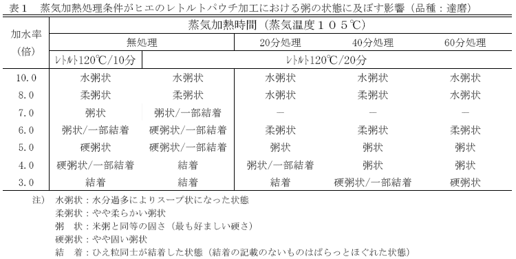 白干しヒエを洗穀後、蒸気加熱処理することにより、レトルトパウチ粥の加工時におけるヒエ粒の結着を抑制することができ、つぶつぶ感を活かした粥が製造できる(図1、表1)。 |