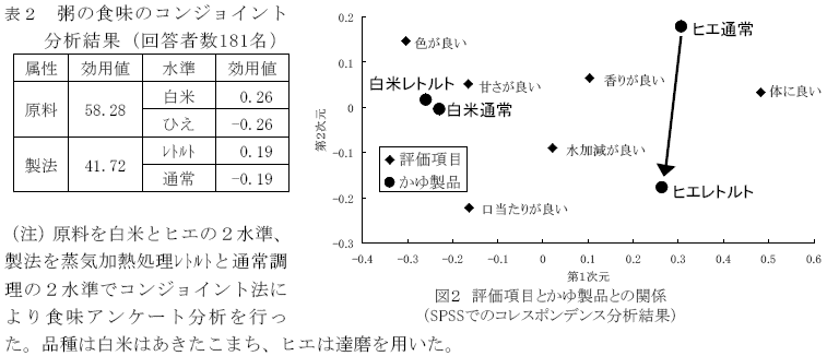 白粥、塩味粥、和風調味粥、洋風調味粥の4種類のレトルトパウチヒエ粥を試作し消費者アンケートを実施したところ、和風調味粥は30代、40代及び女性の評価が高く、洋風調味粥は副原料のバターの脂っぽい味がヒエの健康志向イメージと合致せず評価は高くなかった。 |