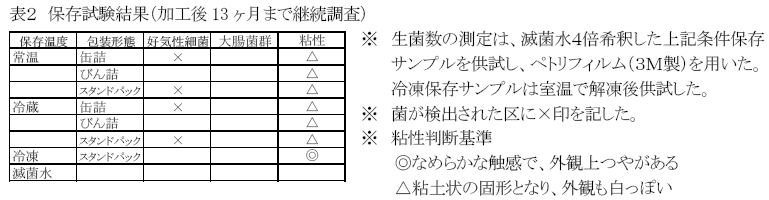 ペースト状ハトムギ茶は、プラスチックフィルム製の袋に充填し、冷凍(−25℃)保存する方法が最も触感や外観の変化が少なく保存性が高い(表2)。 |