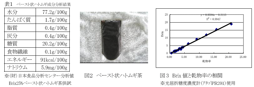 ペースト状ハトムギ茶は、Brix値と乾物率の相関が高いこと(図3)から、製品仕上げ点の簡易な判断方法としてBrix値を用いることができる。 |