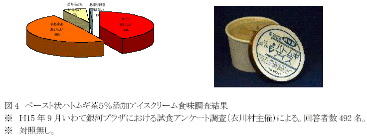 Brix値25%前後に調製したペースト状ハトムギ茶は、製造工程を大きく変えることなくアイスクリーム原料に容易に混合でき、5〜10%を添加することにより食感を変えずに風味の良いアイスクリームの製造が可能である(図3、4)。また、和菓子、洋菓子類にも広く用いることができる。 |