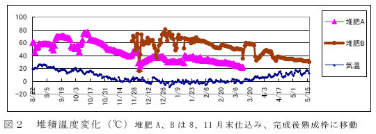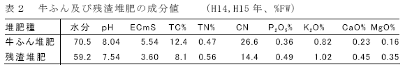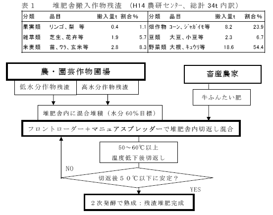 今後農業の自然循環機能を高めるためには、農作物残渣や家畜糞尿等の有機物循環技術の確立が不可欠である。しかし、家畜糞尿の堆肥化に比べ農作物残渣の有効利用は進んでいない。一方、岩手大学で開発したマニュアスプレッダーを利用した家畜糞堆肥化技術は、農家の一般所有機械を活用した低コスト手法である。そこでこの手法を研究機関の農作物残渣処理に応用した結果を取りまとめ、農家や集団でも利用可能な堆肥化手法を提案する。 |