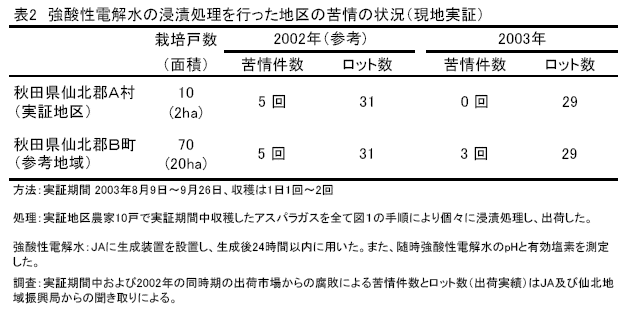 秋田県の露地長期どりアスパラガスで出荷後一部に茎先端部が軟化・腐敗するものがみられ、市場からの苦情・返品等問題となっている。腐敗原因の一つとして軟腐病菌(Erwinia carotovora sbsp. carotovora)が関与していることが明らかとなっているが、収穫後の腐敗であるため農薬での対策が困難である。そこで、アスパラガスをカット野菜の腐敗防止に使用されている強酸性電解水(M社製強酸性電解水生成装置により生成)に浸漬処理し、収穫後アスパラガスに発生する腐敗を抑制するための手法を提示する。 |