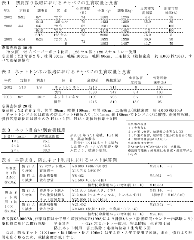 キャベツ栽培において、4月上旬までの定植(早春まき栽培)ではべたがけとペーパーポット育苗による生育期間の短縮によって、また通常の初夏〜夏秋採り栽培では1×1mmの防虫ネットの利用によって、殺虫剤の使用を省略できる。