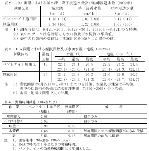 ベントナイトの施用により、畦畔浸透水量は無施用の20%程度に低下し、日減水深は50%程度に減少する(表2)。これにより、灌漑回数は半減し、平均水温で0.4℃、平均地温で0.6℃の温度上昇が認められた(表3)。 |