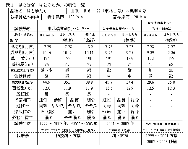 | はとむぎ「はとゆたか」は 東北地方の栽培に適し、大粒で多収であり、お茶加工に優れる。成熟期は「はとじろう」より遅く、「中里在来」より早い、やや早生に属する。 | |