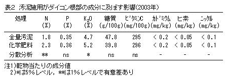 全量汚泥区では化学肥料区に比べてダイコン根部の全窒素は少ないが、糖質やビタミンCに差はなく有害な重金属濃度にも問題はない(表2)。 |
