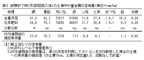 汚泥を長期連用した場合は、銅、亜鉛などの重金属の土壌への負荷量が高まると考えられる(表3)ので、汚泥及び土壌中の重金属含有量のモニタリングは定期的に行う必要がある。 |