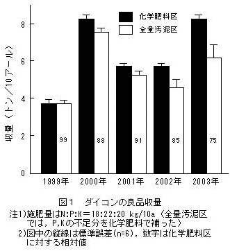 脱水汚泥を窒素肥料として全窒素換算で全量代替利用しダイコンを栽培した場合(全量汚泥区:汚泥施用量は乾物で270 kg/10a相当)には、ダイコンの良品収量が化学肥料で栽培した場合(化学肥料区)に比べ平均で14%程度減少する。これは、汚泥の窒素無機化率が低いことが一因であると考えられる(表1、図1)。 |