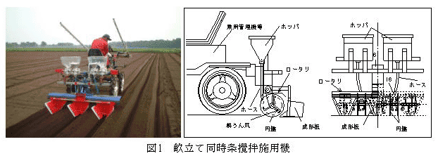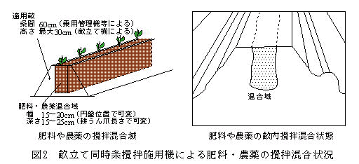 本機を用いることによって、畝の上部中央の定植する位置の近辺に肥料や農薬を混合施用することができる(図2)。なお、施用する幅は、円盤間の距離を変えることによって、施用する深さは使用する耕うん爪の長さによって変えることができる。 |