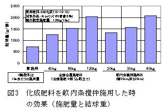 キャベツやハクサイの定植前の畝立て時に、全面全層施用時繰出量の50%量の粒状化成肥料を、畝中央の幅20cm×深さ20cmの範囲に畝内条攪拌施用することによって、全面全層施用時と同等の結球重が得られ、これにより単位圃場面積当たりの施肥量を1/2程度に削減することができる(図3)。 |