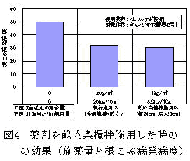 キャベツ定植前の畝立て時に、根こぶ病防除剤「フルスルファミド粉剤」を、全面全層施薬の場合と同濃度になるように、畝中央の幅20cm×深さ20cmの範囲に畝内条攪拌施用することによって、全面全層施薬時と同等の防除効果が得られ、これにより単位圃場面積当たりの薬剤施用量を1/3程度に削減することができる(図4)。 |