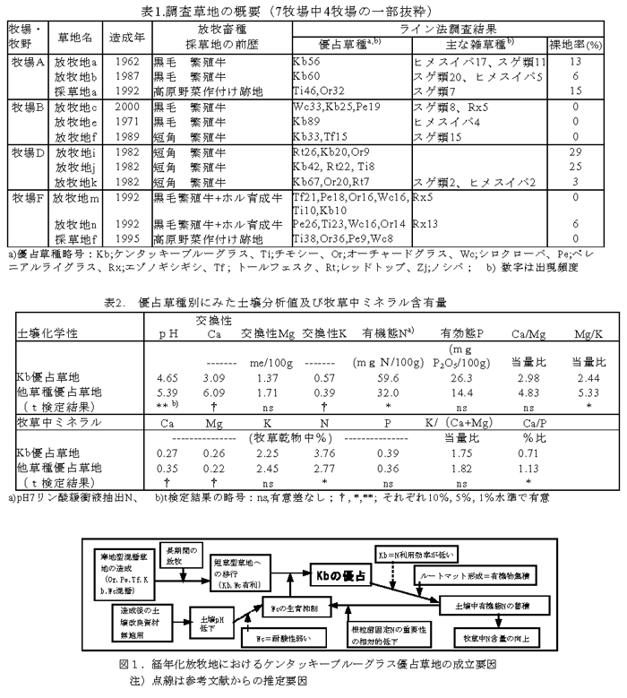 Kb優占草地の成立要因として、他草種の生育を抑え短草型草種であるKbの生育に有利に働く要因が考えられる。即ち、長草型草種の生育を抑制する長年の放牧及び低施肥管理、また、Wcの生育を抑制する土壌改良資材の不足による土壌pHの低下及びKbのN利用効率の低さによる土壌中Nの蓄積などが考えられる(表1、2、図1)。 |
