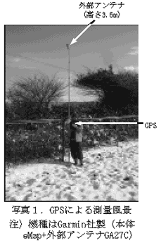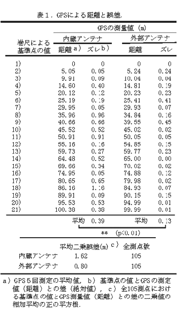 草地内の距離を小型GPSに外部アンテナを付加して測量(以下小型GPS測量)すると単体(内蔵アンテナ)で測量するよりも距離のズレが少ない(写真1、表1)。また測量精度を示す平均二乗誤差は外部アンテナ使用時には0.80m(国土調査の精度区分の乙三(山林・原野の区域)に該当する、国土調査法施行令別表第五より)で、単体の1.62mに比べ精度が改善する(表1)。 |