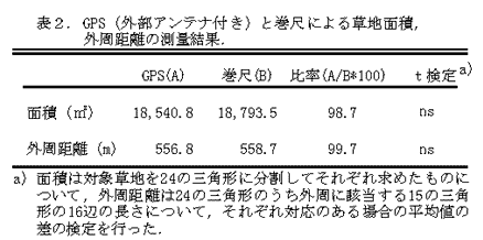 小型GPS測量による対象草地の面積及び外周距離の実測値を巻尺による測量値と比較すると、面積は巻尺の98.7%、外周距離は99.7%であり、両者の測量結果は、草地面積や外周距離の値に有意差はなく同じ水準である(表2)。 |