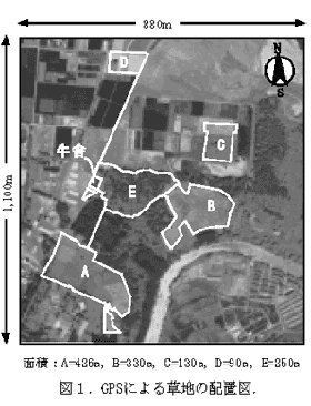 小型GPS測量による草地の位置は航空写真の判読による位置とほぼ一致し、草地の位置や形状の分かる簡易な草地の配置図が得られる(図1)。 |