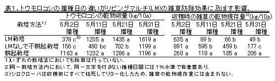 被覆植物としてあらかじめ定着させておいたWCをフレールモア等で刈り払い・細切した後、トウモロコシを不耕起播種すれば、除草剤なしで雑草を防除することが可能である。しかし、被覆植物としてのWCは雑草だけでなくトウモロコシの生育も抑制し、この抑制力はトウモロコシの播種期が早いほど強まるため、早播きでの多収は望めない。WCによるトウモロコシへの生育抑制を軽減し、かつ雑草を確実に防除するには、5月下旬以降にトウモロコシを播種する必要がある(表1)。 |