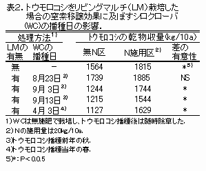 WCを被覆植物としたLM栽培下では、WCからトウモロコシに窒素を移譲させることができるが、窒素移譲効果はWCの播種期によって大きく変動する。高い窒素移譲効果を得るには、トウモロコシ播種前年の8月下旬までにWCを播種する必要がある。9月以降またはトウモロコシ播種当年の播種では、LM栽培はむしろ窒素欠乏の要因となる(表2)。 |