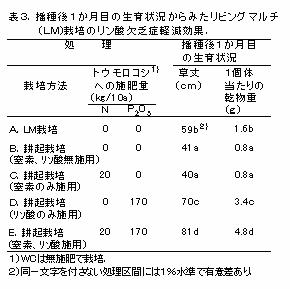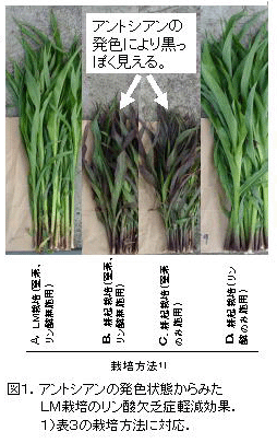 WCを被覆植物としたLM栽培を行うと、リン酸肥沃度の低い圃場であっても、トウモロコシにリン酸欠乏が起こりにくくなる(表3、図1)。 |