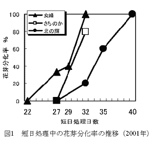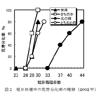 露地・半促成栽培用の休眠の深い品種‘北の輝’では、これらの早生品種より約10日程度花芽分化が遅れ、短日処理の日数は40〜45日程度となる(図1、2)。 |
