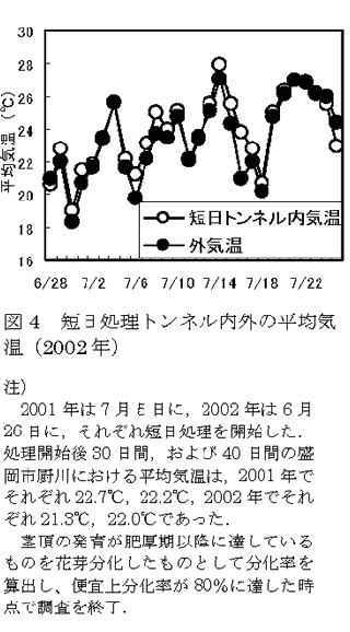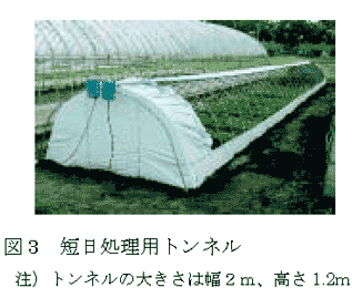盛岡市において、図3に示すようなトンネルに遮光資材(ホワイトシルバー100等)を展張し、冷房装置等を伴わない簡易な短日処理施設で8時間日長(9:00〜17:00)の処理を行った場合、外気温との気温差はわずかである(図4)。 |
