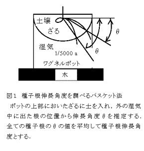 Rosella(オーストラリアの品種:深根性)と東山30号(後のキヌヒメ:深根性)の雑種第一代に関東119号(後のあやひかり:浅根性)を交配して得た雑種第一代にトウモロコシを交雑し、得られた小麦半数体にコルヒチン処理による染色体倍加を行って遺伝的に固定した倍加半数体を得た。これらの129系統についてバスケット法(図1)により種子根伸長角度を測定して伸長角度の小さい9系統(浅根性系統とする)と大きい9系統(深根性系統とする)を選抜した。 |