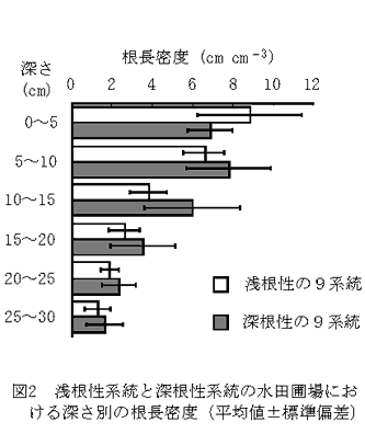 浅根性の9系統と深根性の9系統を水田圃場に栽培して、登熟期に改良モノリス法で土壌を採取し、根を洗い出して根長密度を調べると、深さ0から5 cm の浅い層では浅根性系統の根長密度が高く、深さ5から30 cm の層では逆に深根性系統の根長密度が高い(図2)。このことは、根系の深さの異なる小麦系統の作出に、幼植物の種子根の伸長角度を調べる方法が有効であることを示している。 |