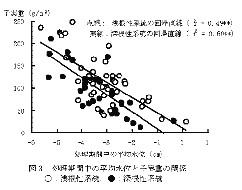 浅根性系統群と深根性系統群を水田圃場に栽培して生育の後半(4月10日から5月30日)に地下水位を上昇させると、両系統群共に子実重は地下水位と強い負の相関関係を示す。しかし、地下水位が同じ場所で比較すると浅根性系統は深根性系統に比べて子実重が大きい傾向にある(図3)。 |