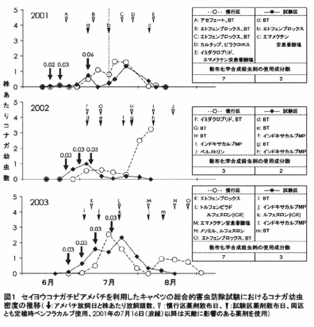 コナガ以外の害虫として北東北地域のキャベツ栽培で問題となるヨトウガやタマナギンウワバ、アブラムシ類等に対しては、天敵に悪影響の少ない定植時処理殺虫剤やBT剤、IGR剤、インドキサカルブMP剤、交信攪乱剤などの利用と土着天敵の保護により防除する。 |